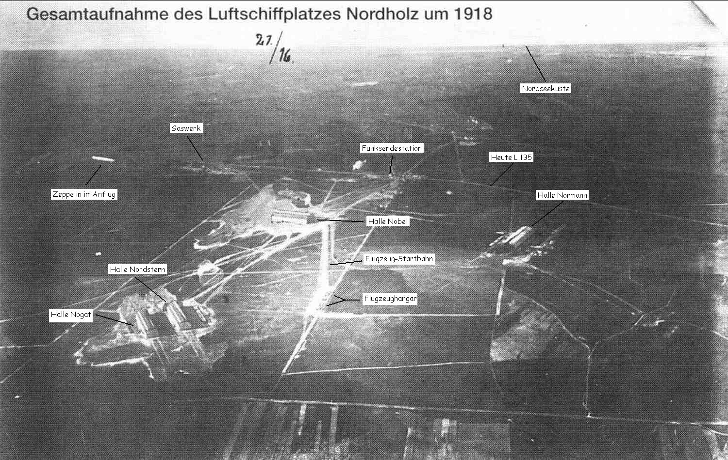 Luftbild des Zeppelinflughafens Nordholz mit Erklärungen. Blickrichtung etwa süd-west.
