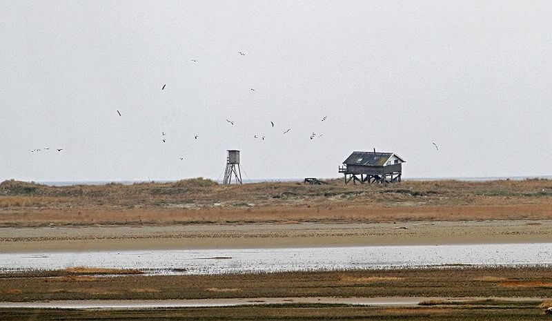 Blick von Scharhörn auf Nigehörn. Links der Zählturm, rechts die nie bewohnte verfallende Vogelwärterhütte