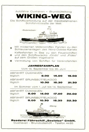 Da die Lotsen dringend eine Transportmöglichkeit benötigen, gründen sie im selben Jahr gemeinsam die "Fährschiff Seelotse GmbH" und gehen mit einem zur Jacht umgebauten ehemaligen Flugsicherungs- oder Torpedofangboot [3], der "Seelotse 2" an den Start. Da das Schiff aber für den Passagierverkehr nicht ausreichend seefest ist, wird die "Niedersachsen" aus Landesmitteln grundüberholt und gechartert. Unter der Regie der Elblotsen wird die "Wiking" gebaut und seit dem 1. April 1960 auf dieser Route eingesetzt. Weiterhin wird die "Niedersachsen" zum 11. Mai 1964 nochmals umgebaut und modernisiert. Danach kann sie käuflich von der Lotsengemeinschaft übernommen werden. Diese beiden Fährschiffe konnten auch eine begrenzte Anzahl an PKW mitnehmen. Mittlerweile war auch der Auto-Fahrstuhl durch eine Hubrampe ausgetauscht worden, was die Be- und Entladung erheblich vereinfachte. Als Kuriosum hatte die WIKING mangels Größe auf dem Heck eine Drehscheibe, auf der die Fahrzeuge zum Einparken auf dem Deck in die gewünschte Richtung gedreht werden konnten.