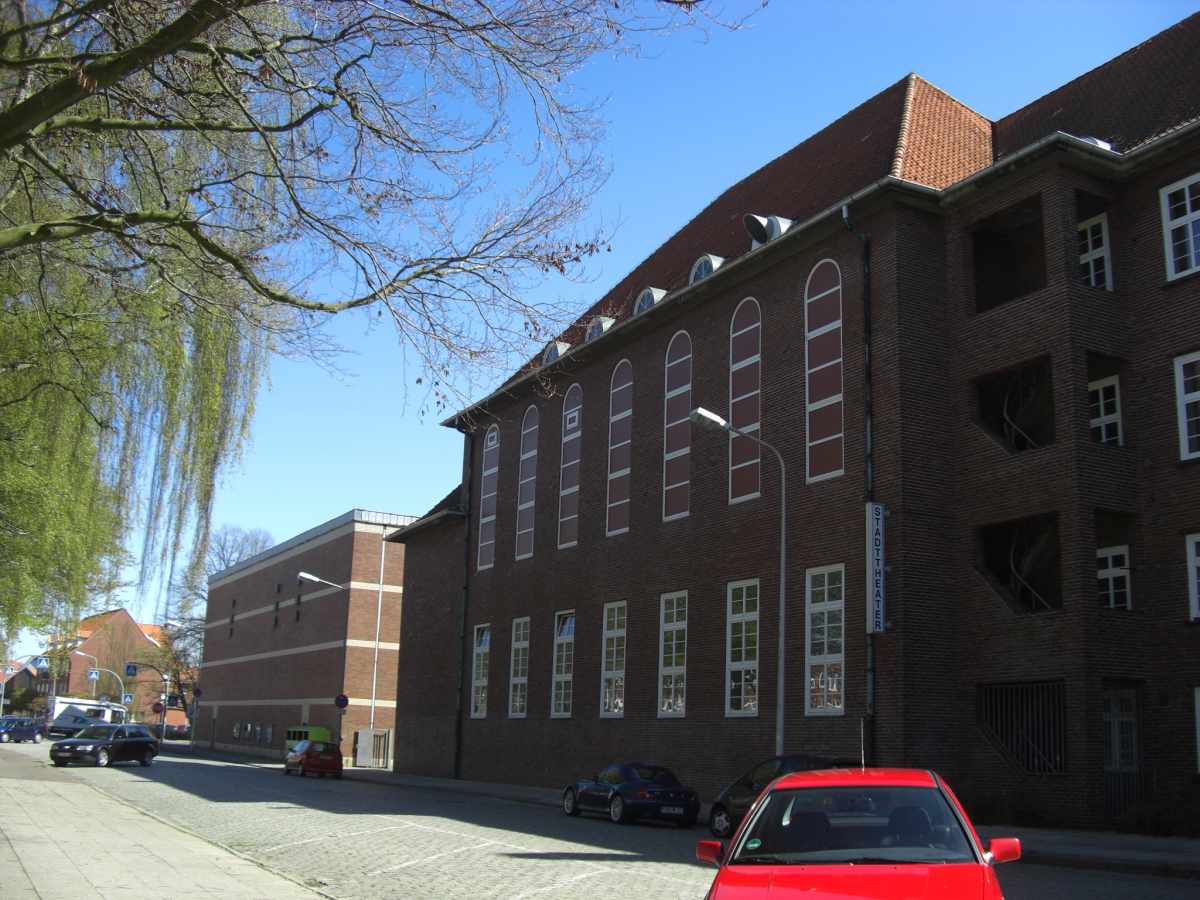 Bleickenschule Nordtrackt mit Aula/Stadttheater (oben) und alter Turnhalle (unten). Im Hintergrund der Hochbunker am Rathaus.