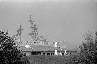 Normaluhr am Döser Strand mit Kriegschiff auf der Elbe