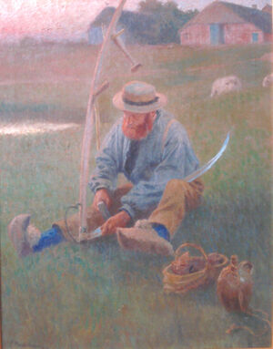 Duhner Bauer beim Dengeln der Sense