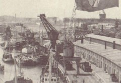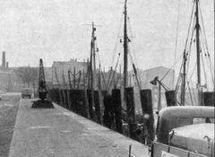 Links im Bild vermutlich Nachfolger des ersten Cuxhavener Kranes am Tonnenhafen, Ecke Alte Hafenkaje.