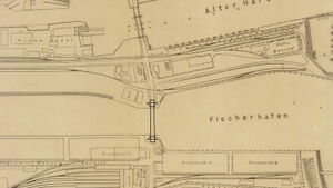 Die Cuxhavener Schwebefähre sollte die durch den Bau des Alten Fischereihafens unterbrochene Hafenstraße ersetzen. Die geplante Schwebefähre ist der Grund für die Einengung der Hafenzufahrt. Aus Kostengründen wurde sie nie gebaut.