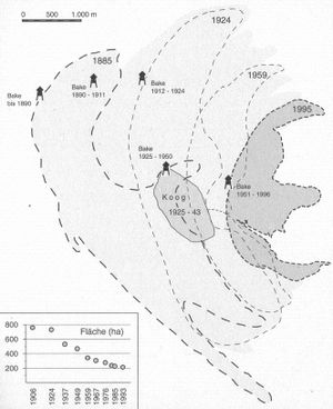 - bis 1921 Jährlicher Rückgang der Strandbreite um 30 Meter (von 1500 m 1884 auf 260 m)